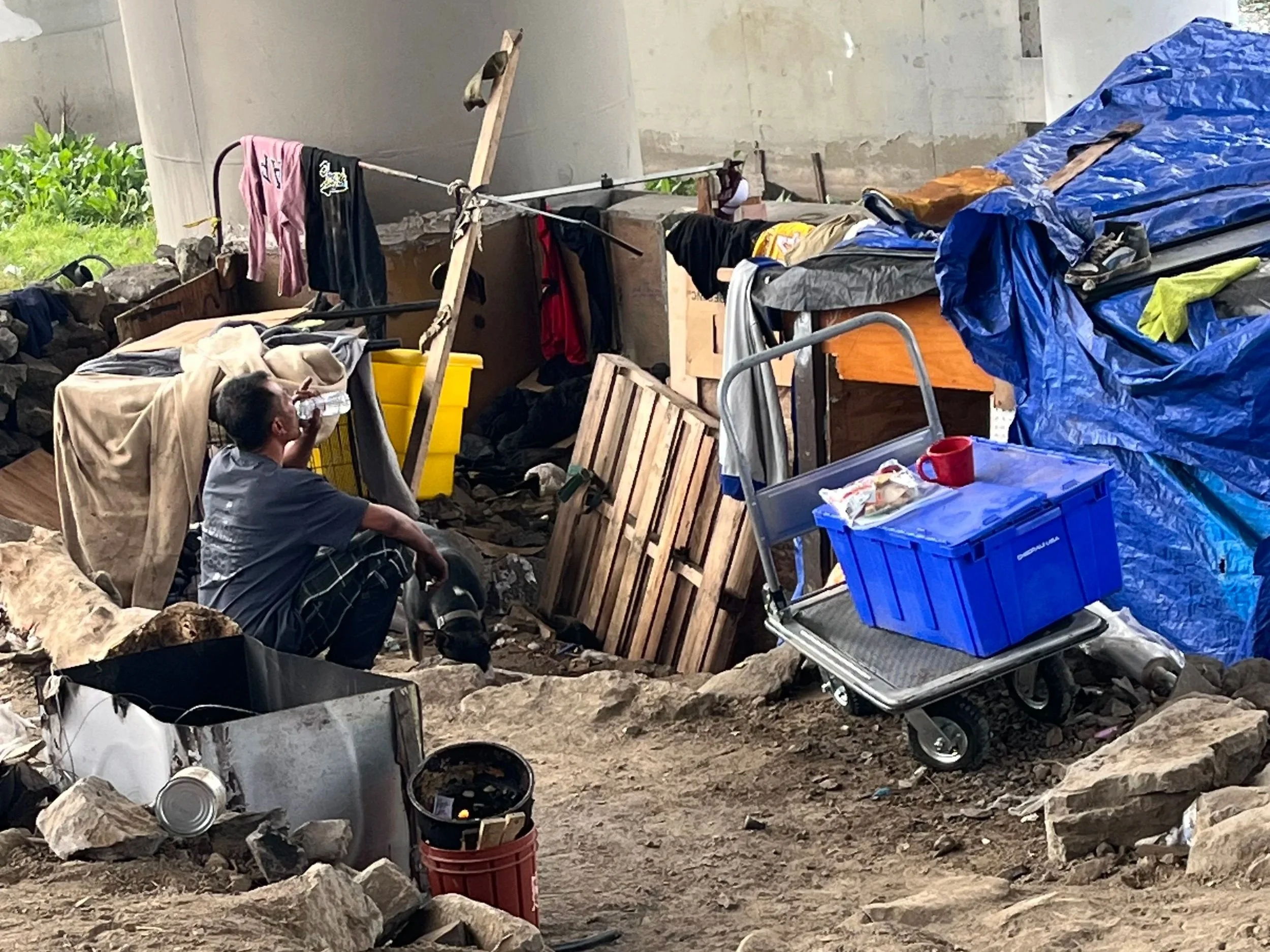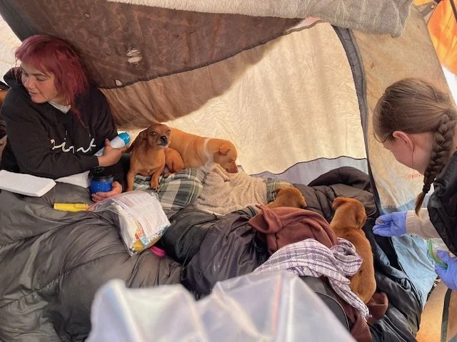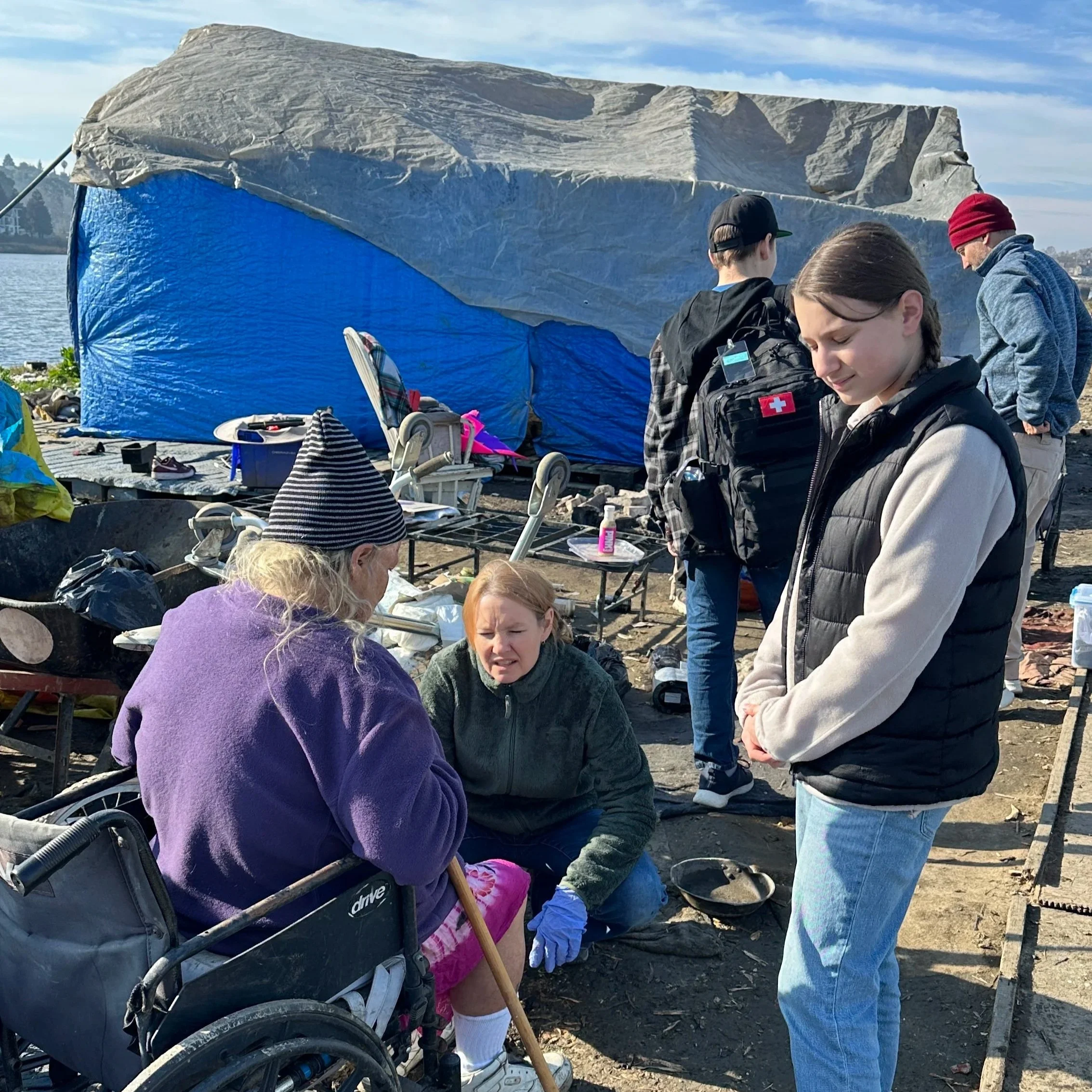 Our Vallejo team found Sondra in her tent with seven puppies. It was providential to have a nurse with this team. She provided care from the medical supplies we carry as well as compassion and comfort through prayer as Sondra shared her struggles. She tearfully accepted a Bible, hot coffee, a bagged lunch, and other supplies.